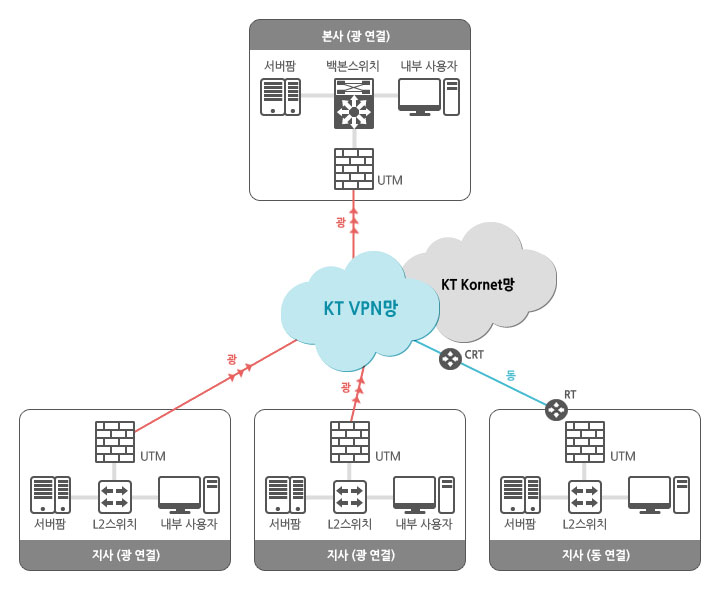 광 VPN 서비스는 중소기업이나 소규모 매장 및 사업장에 적합한 이용자 중심의 저가형 VPN 서비스로 각 지점에 VPN장비를 구축하여 사내 네트워크와 인터넷, 보안까지 일괄 제공하는 종합 보안 네트워크 서비스입니다.