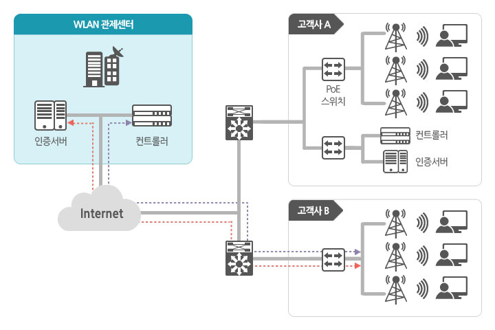 | 서비스형 | 설명 | 무선LAN Core 인프라를 kt내에 구축하고 고객 구내에는 설치된 AP와 연계하여 기업고객 구내에 무선LAN 환경구축, 관제, 유지보수를 통합적으로 제공하는 서비스 |